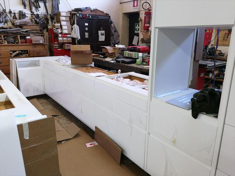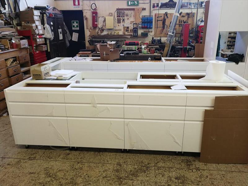 L’ambiente, caratterizzato da ampie aperture e da una forte luce naturale proveniente dal fronte mare, ha richiesto un’attenta valutazione dei flussi luminosi e della ventilazione. La configurazione è stata studiata per sfruttare l’areazione naturale estiva e per garantire uniformità illuminotecnica sulle superfici di lavoro. Il coordinamento con il cantiere ha permesso di predisporre con precisione tutti gli impianti, assicurando un’integrazione millimetrica tra arredi e architettura.
