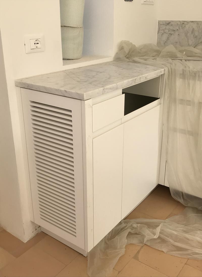 Cucina su misura laccata bianco seta opaco e marmo Calacatta.